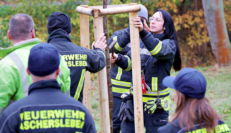 Es ist ein kühler Sonnabend auf der Eineterrasse, doch die Stimmung ist herzlich. Menschen stehen zusammen, halten Urkunden in den Händen, machen Fotos – Erinnerungen an einen besonderen Moment. Denn bei der symbolischen Herbstpflanzung der Aktion „Mein Baum für Aschersleben“ geht es nicht nur ums Pflanzen, sondern auch ums Erinnern, Danken und Weiterdenken. In diesem Herbst sind 46 neue Bäume für das Stadtgebiet gestiftet worden. Gepflanzt wurden sie bereits in den vergangenen Tagen – an Standorten in der Kernstadt, am Stadtrand und in den Ortsteilen. Nur ein Baum wird an diesem Sonnabend noch gesetzt: Die Ortsfeuerwehr Aschersleben pflanzt ihre Roterle direkt auf der Eineterrasse und erfüllt damit ihre Nominierung aus der sogenannten „Baumchallenge“ (die MZ berichtete). „Damit haben wir die Herausforderung verwirklicht“, sagt Feuerwehrfrau Debby Heinze, während ihre Kameraden das junge Bäumchen sorgfältig angießen.